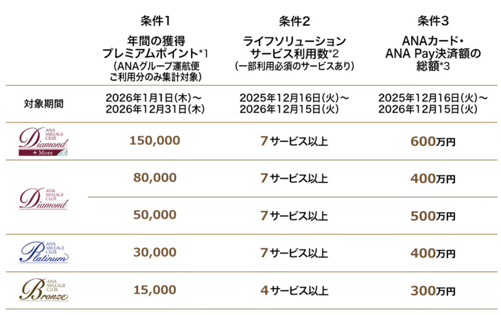 ANAさんが2021年から開始した、新しいANA上級会員資格(ステータス)獲得条件である「ライフソリューションサービスの利用が多い方」向けの条件(旧「プレミアムステータス獲得チャレンジ」)。