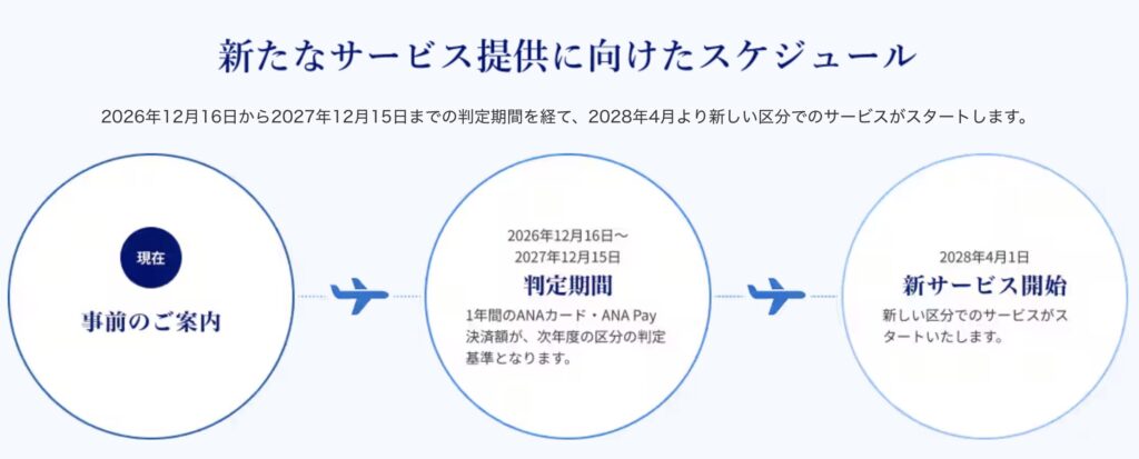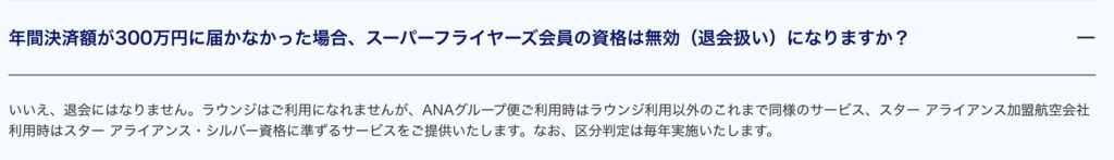判定期間が2026年12月16日〜2027年12月15日に設定されているので、この期間に300万円以上SFCもしくはANA Payを利用しなければ、2028年4月1日からLIGHT会員に分類され、ラウンジ利用権とスタアラゴールド資格は剥奪されます(笑)。