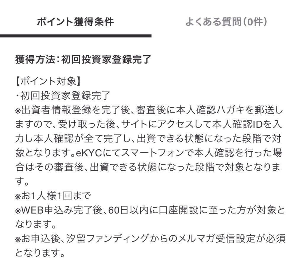- eKYCにてスマートフォンで本人確認を行った場合はその審査後、出資できる状態になった段階でポイント対象