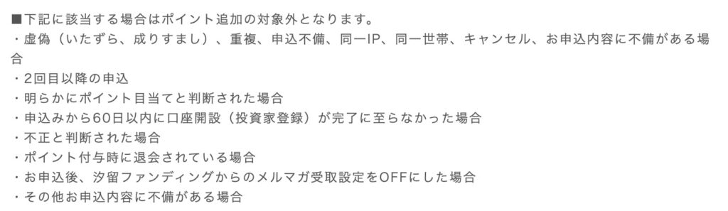 こちらも、特段難しい条件はありません。唯一、同一世帯は不可ですので、夫婦別々に投資家登録して、別々にポイントをもらう!ってことはできない案件です。