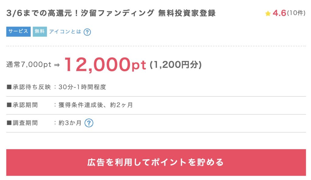 では、続いて案件の詳細を見ていきましょう。ポイントインカムさんの汐留Funding案件がこちらですね。