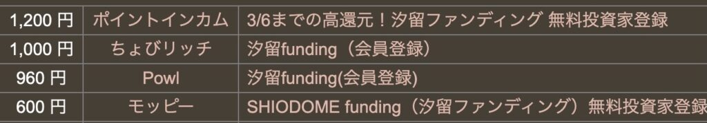 なお、不動産クラウドファンディング系ポイントサイト案件は、今回ご紹介する「汐留ファンディング」のようにまずは設立当初は投資家登録だけでポイント!って案件からスタートして・・。