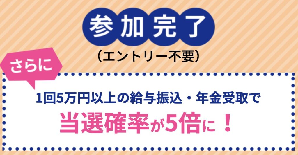 エントリーは不要ですし、1回5万円以上の給与振込・年金受け取り=今回のポイント獲得条件達成で、当選確率が5倍になるので・・。