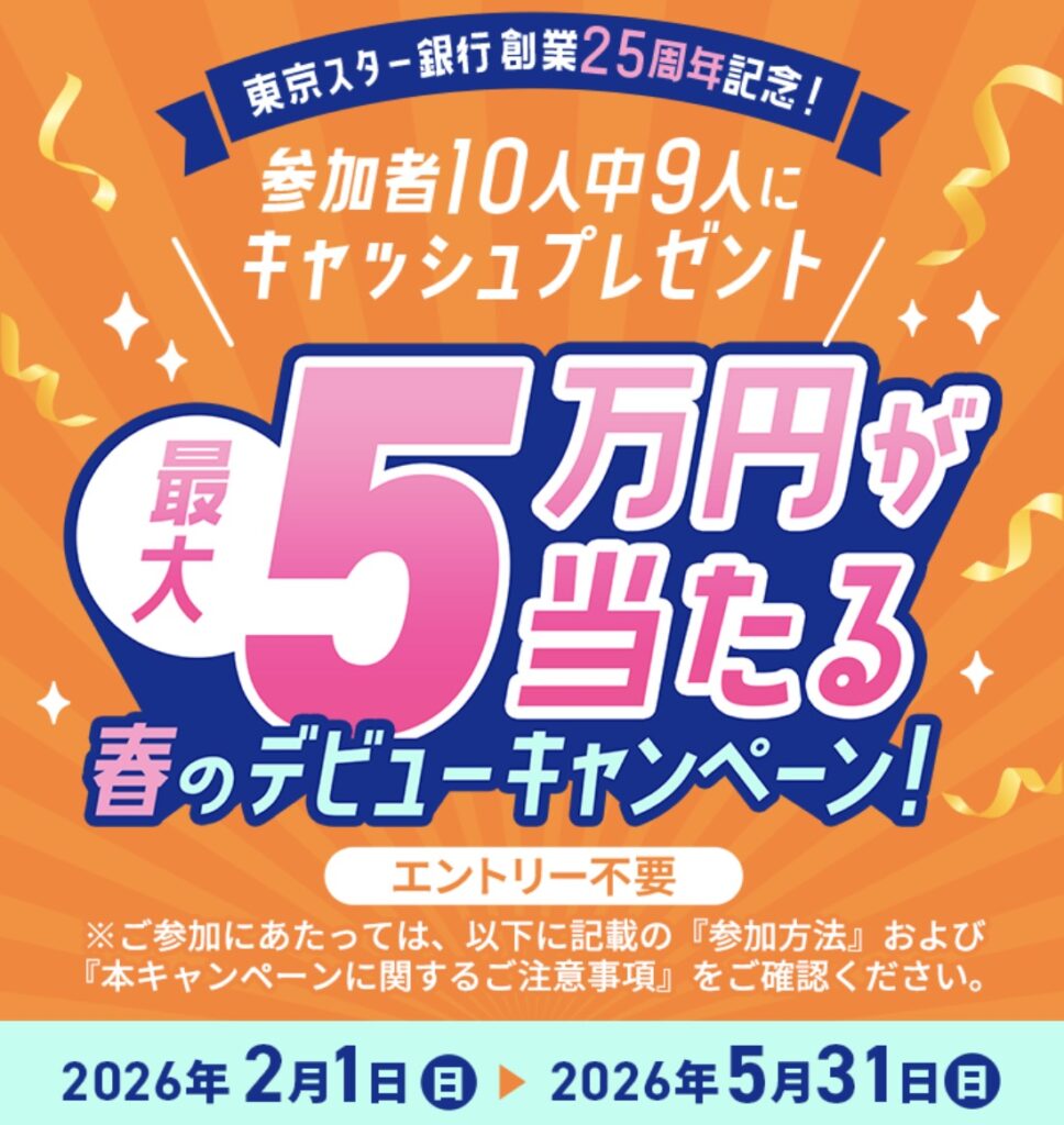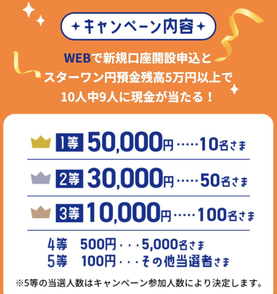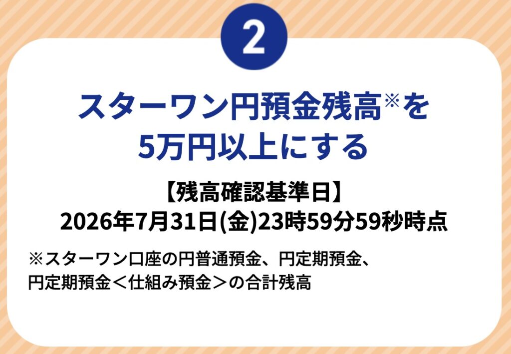 キャンペーン期間中にWEB新規口座開設申し込みをし2026年7月31日(金)時点にスターワン円預金残高5万円以上にすると、