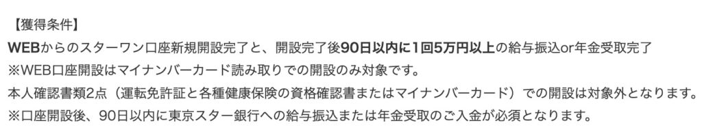 ご覧のとおり、新規口座開設+開設完了後90日以内に1回以上5万円以上の給与振込or年金受け取り完了で、ポイント対象になります。