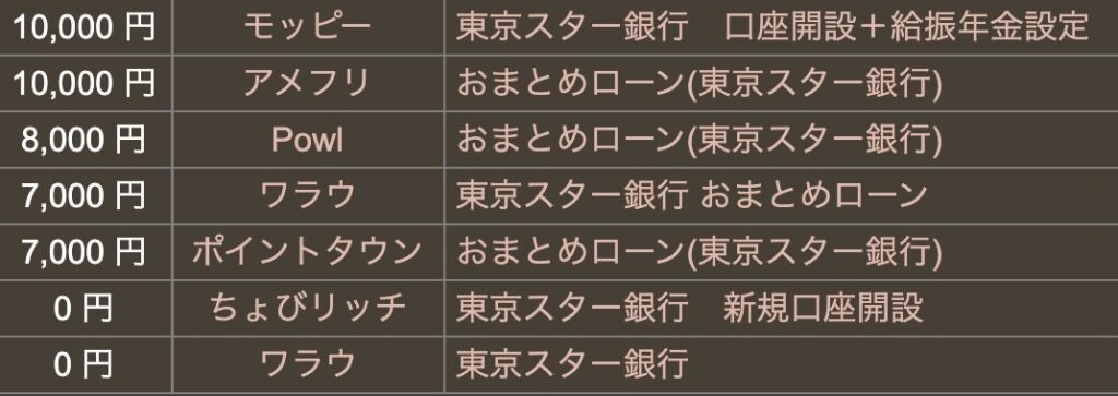あ、他にも「東京スター銀行」案件はありますが、「おまとめローン」案件だったり、「口座開設だけだけど、もらえるポイント0円」案件だったりするので、実質はモッピー限定です。