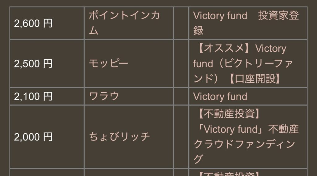 ご覧のとおり、この「Victory fund」案件は、ポイントインカムさんで2,600円を叩き出しています!