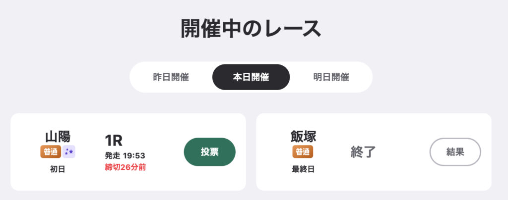 なお、オートレースの場合なんと1日の休みもなく、全国5つのオートレース場で365日ほぼ毎日、朝10時頃~夜23時頃まで開催されているので、この時間帯までに初回起動させれば、即日投票することができます。