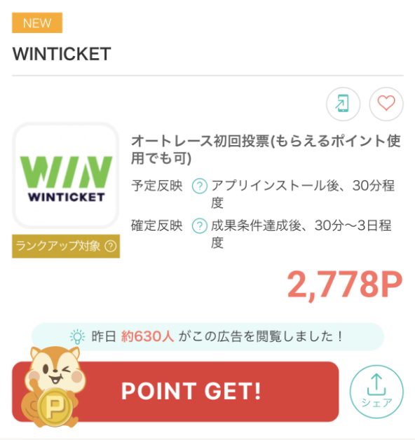 この記事でご紹介する「WINTICKET」案件の、ポイントサイト案件がこちらですね。(スマホからしかアクセスできません。)